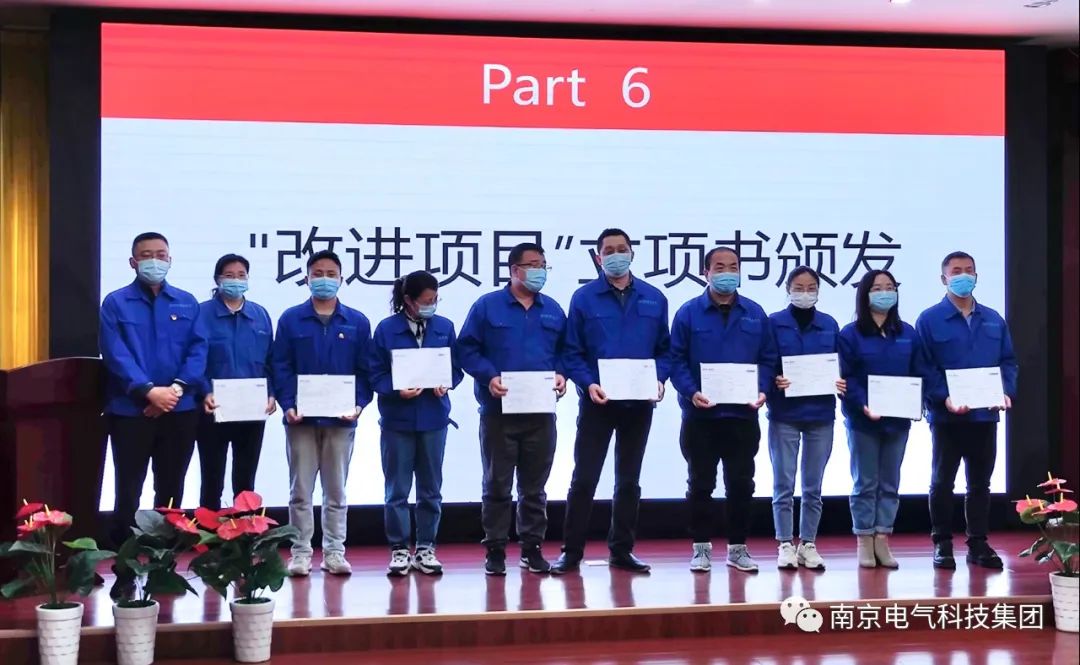 南京电气科技集团副总经理、绝缘子公司总经理程洪亮向绝缘子公司本年度立项的“玻璃绝缘子结构高度离散性控制”等11个“改进项目”的项目组负责人颁发了项目立项书,为六西格玛“黑带”获得者向孟宇、“绿带”获得者刘仁伟颁发聘书,并对今年公司技术质量工作寄予厚望。