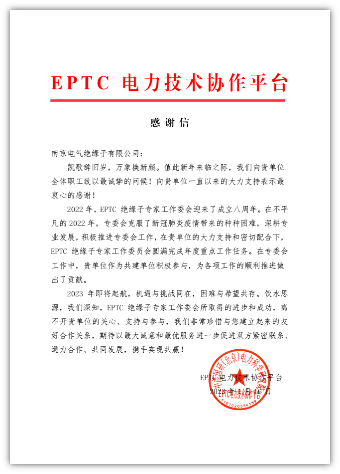 1月16日,EPTC电力技术协作平台向南京电气绝缘子有限公司发来感谢信,对南京电气在过去的一年中对EPTC绝缘子专家工作委会工作的支持表示感谢。
